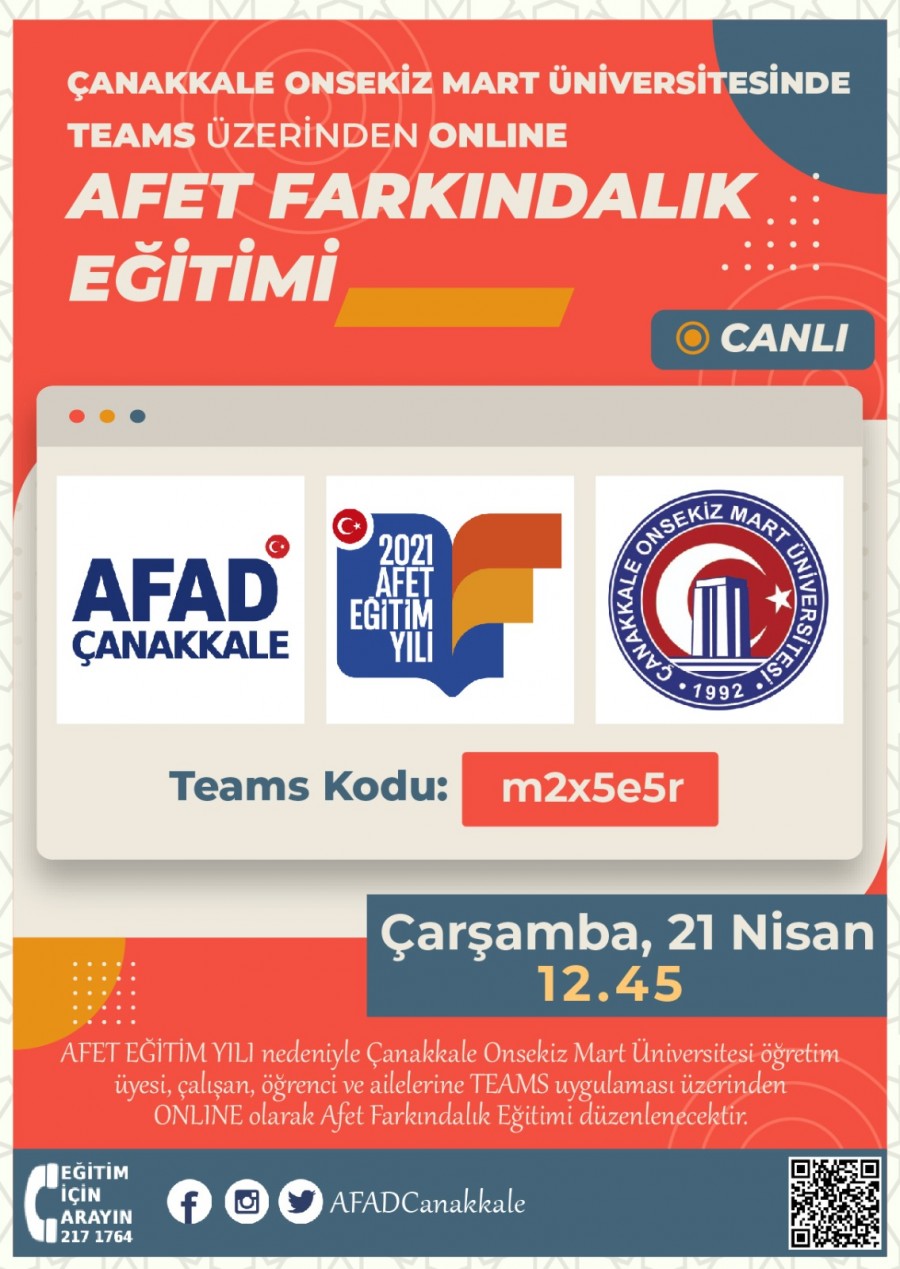 Biga Uygulamalı Bilimler Fakültesi ve AFAD Çanakkale işbirliğiyle 21 Nisan 2021 Çarşamba günü saat 12:45'de Microsoft Teams üzerinden çevrimiçi olarak gerçekleştirilecek "Afet Farkındalık Eğitimi"ne tüm akademik ve idari personelimiz ile öğrencilerimiz davetlidir.