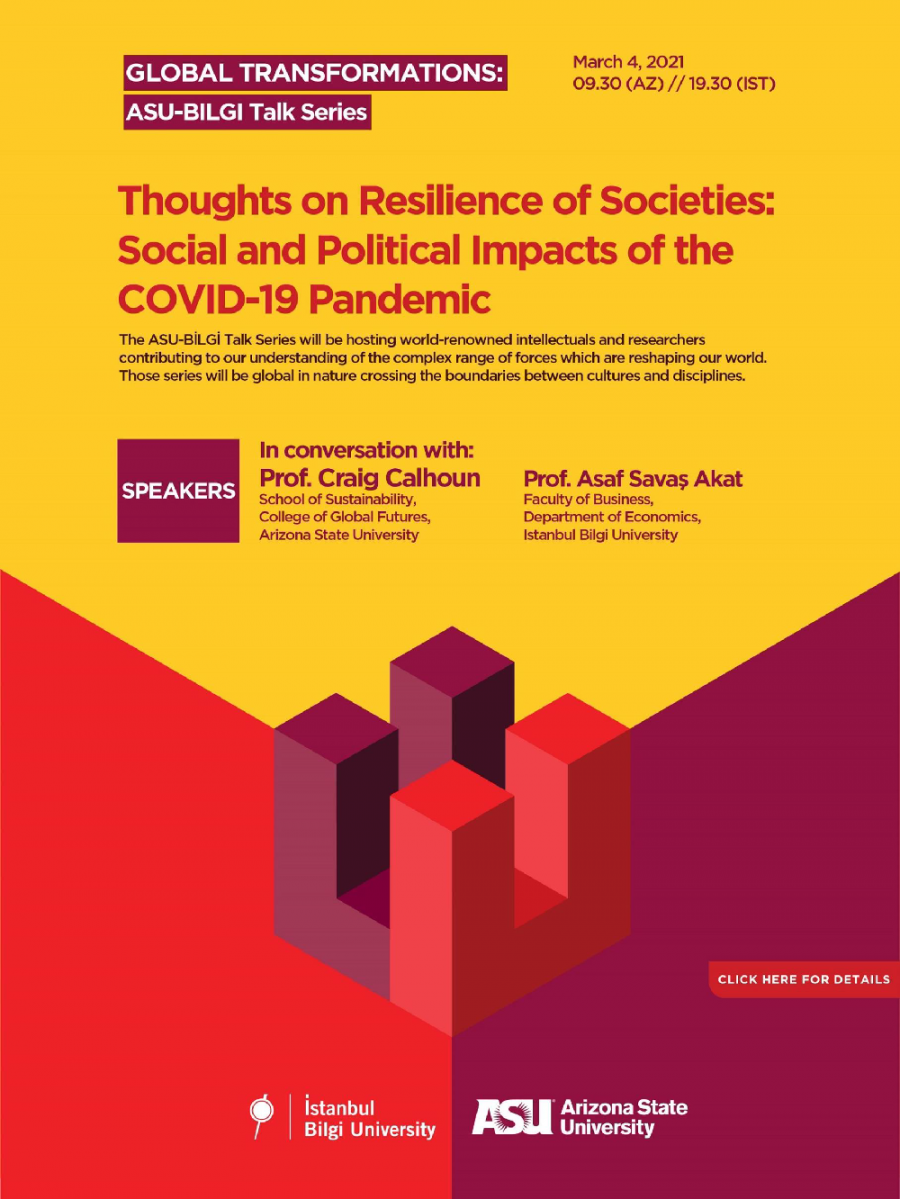 İstanbul Bilgi Üniversitesi ve Arizona State University'nin akademik işbirliği ile iki ayda bir gerçekleştirilecek olan "Global Transformations: ASU-BİLGİ Talk Series" söyleşi serisinde "Thoughts on Resilience of Societies: Social and Political Impacts of the COVID-19 Pandemic" konu başlığı ile ilk söyleşi 04.03.2021 tarihinde çevrimiçi ve etkinlik dili İngilizce olarak gerçekleştirilecektir.