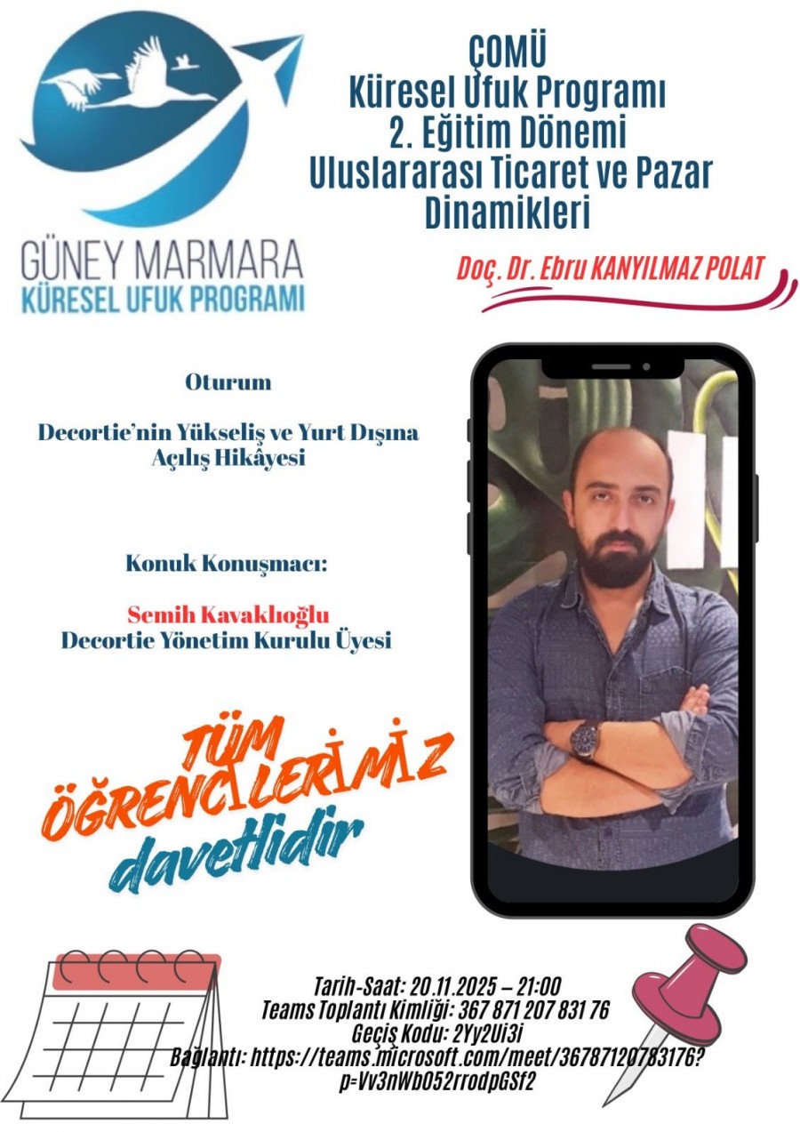 Program kapsamında Uluslararası Ticaret ve Pazar Dinamikleri dersinin teorik içeriğini desteklemek amacıyla gerçekleştirilecek “örnek olay” uygulamasında "Decortie'nin Yükseliş ve Yurt Dışına Açılış Hikayesi" incelenecektir. Tüm öğrencilerimiz davetlidir.