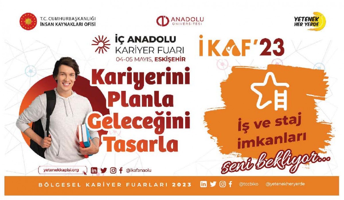 4-5 Mayıs tarihlerinde Türkiye Cumhuriyeti Cumhurbaşkanlığı İnsan Kaynakları Ofisi koordinasyonunda ve Anadolu Üniversitesi ev sahipliğinde Eskişehir'de düzenlenecek olan İç Anadolu Kariyer Fuarı'nda yüzlerce firma ile iş ve staj imkanları, mülakat simülasyonları, seminerler, workshoplar, teknik geziler ve daha birçok etkinlik sizi bekliyor.