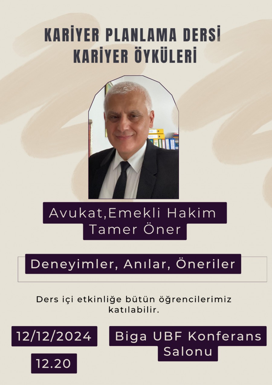 12 Aralık 2024 Perşembe günü Kariyer Planma dersi kapsamında Avukat, Emekli Hakim Tamer Öner tarafından düzenlenecek olan “Kariyer Öyküleri-Deneyimler, Anılar, Öneriler” semineri tüm öğrencilerimiz davetlidir.