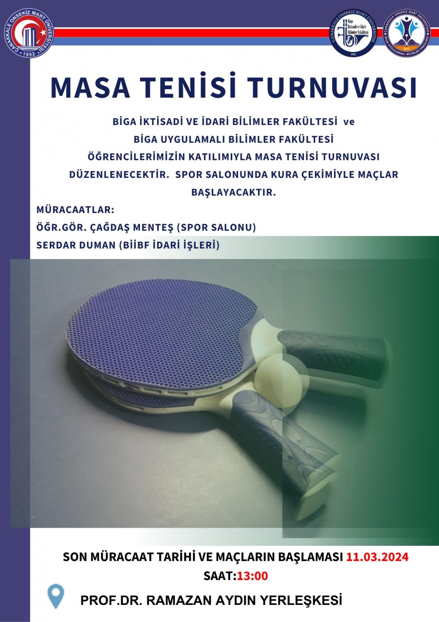 Biga İktisadi ve İdari Bilimler Fakültemiz ve Biga Uygulamalı Bilimler Fakültemiz ortaklığı ile Masa Tenisi Turnuvası düzenlenecektir. Prof. Dr. Ramazan Aydın Yerleşkemizde düzenlenecek olan turnuvaya fakültelerimizin öğrencileri katılabileceklerdir.