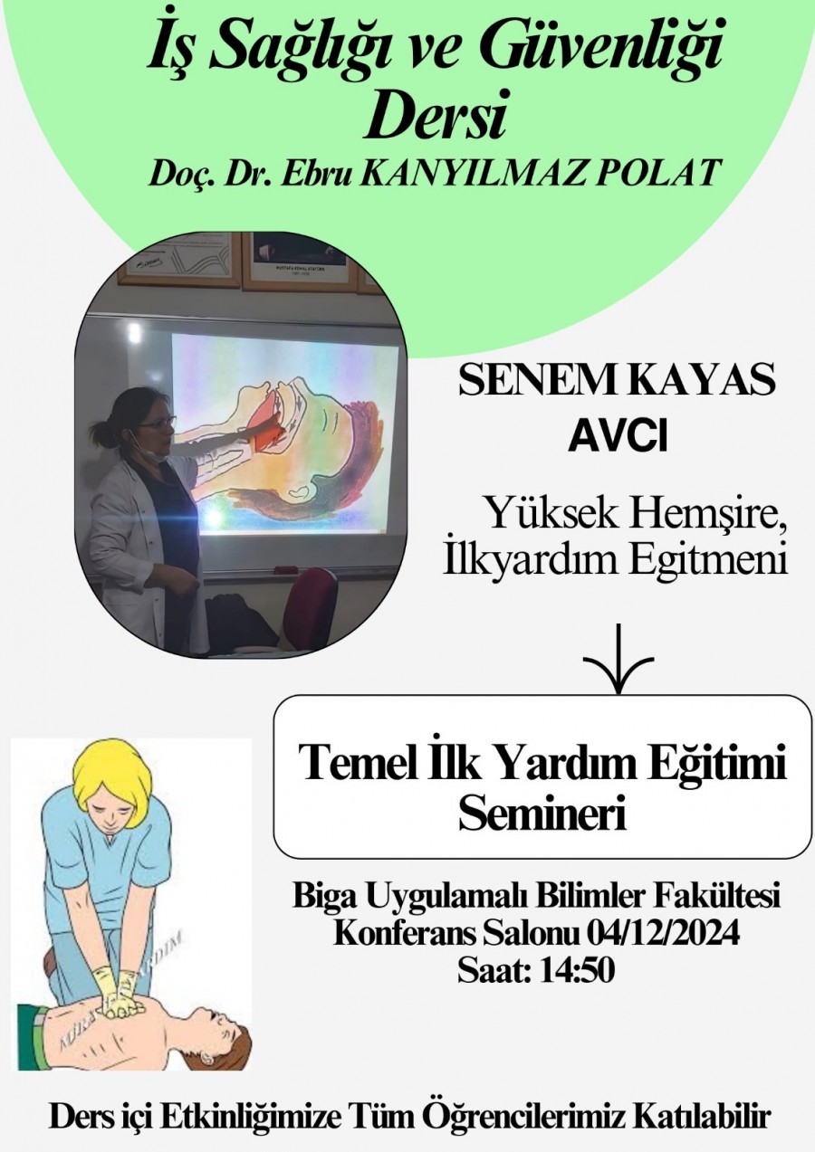 4 Aralık 2024 Çarşamba günü İş Sağlığı ve Güvenliği dersi kapsamında düzenlenecek olan Temel İlk Yardım Eğitimi seminerine tüm öğrencilerimiz davetlidir.