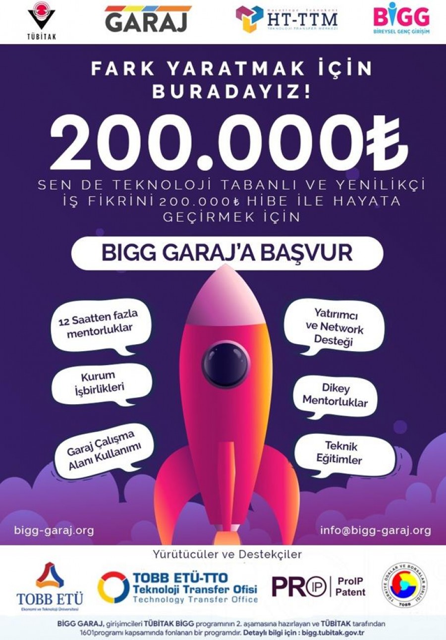 TOBB ETÜ TTO olarak BİGG GARAJ Programı kapsamında sizlere sağlayacağımız İş Planı Yazma Eğitimi, Teknik Eğitimler, Bire bir Mentorluk Desteği vb. tüm hizmetlerimizi ücretsiz olarak gerçekleştireceğiz. Yeni dönemde Hacettepe TTM ile birlikte ortaklaşa yürüttüğümüz programa başvurarak Teknoloji Tabanlı ve İnovasyon içeren projesini gerçekleştirmek ve 200.000 TL geri ödemesiz %100 hibe ile kendi şirketini kurmak isteyen girişimcilerimiz ile birlikte çalışmaktan memnuniyet duyarız.