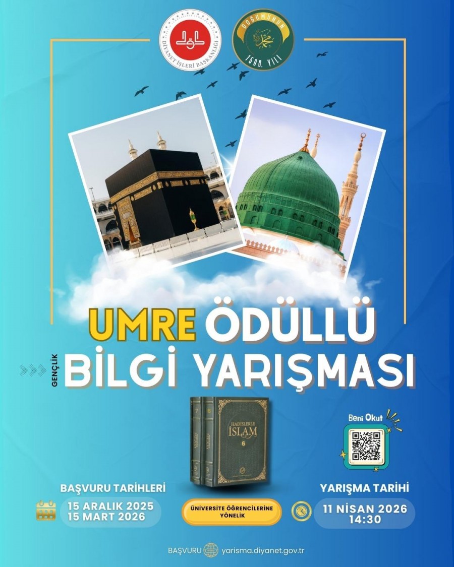 Diyanet İşleri Başkanlığı tarafından gençliğimizin dinî ve ahlaki değerlerini pekiştirmek amacıyla düzenlenen “Umre Ödüllü Gençlik Bilgi Yarışması” ülke genelinde gerçekleştirilecektir.