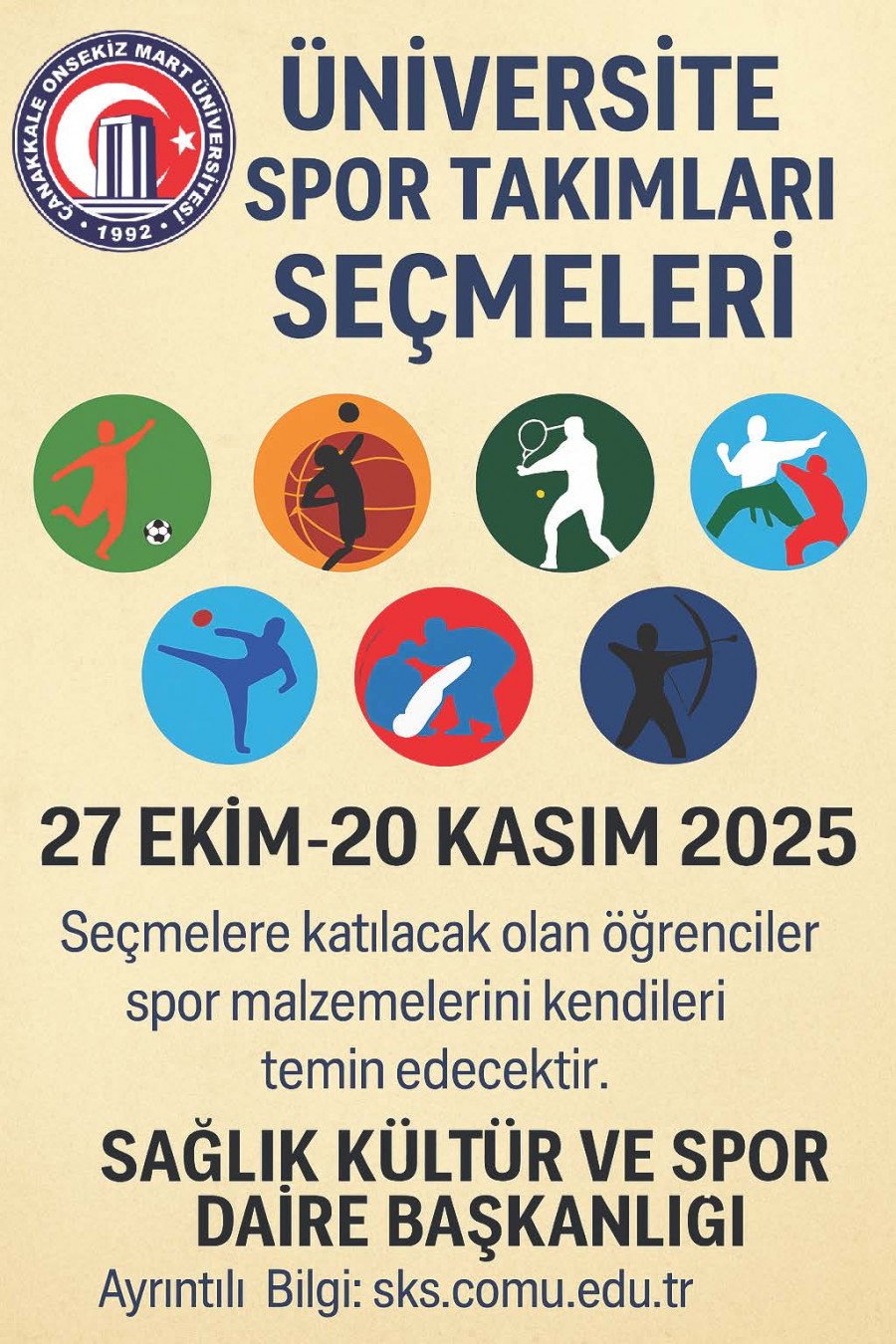 Türkiye Üniversite Sporları Federasyonu tarafından 2025-2026 eğitim-öğretim yılında düzenlenecek yurt içi ve yurt dışı organizasyonlar ile düzenlenecek diğer spor etkinliklerinde Üniversitemizi temsil edecek spor takımlarının oluşturulması için çalıştırıcılar tarafından sporcu seçmeleri konusundaki seçim takvimine aşağıdan ulaşılabilmektedir.